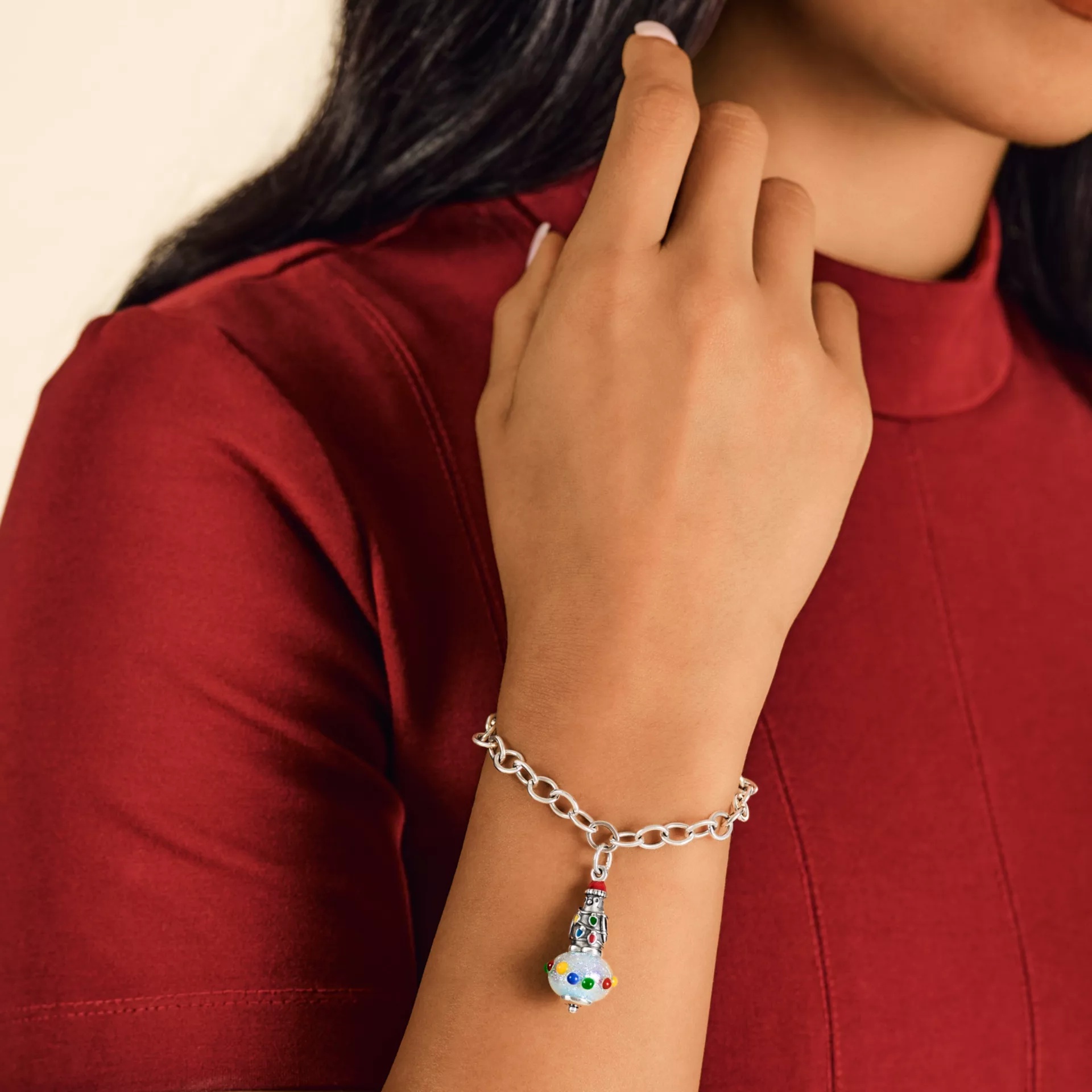 A cute visitor from the South Pole, this penguin got a little too excited getting adorned for the holidays. Dressed in a red enamel beanie and with colorful enameled string lights wrapped around the body, the sterling silver penguin stands atop an icy white glitter art glass bead inspired by snow with a swath of multicolor dots draped around it. Gift this holiday charm to help complete a Christmas charm collection for a bracelet or necklace.