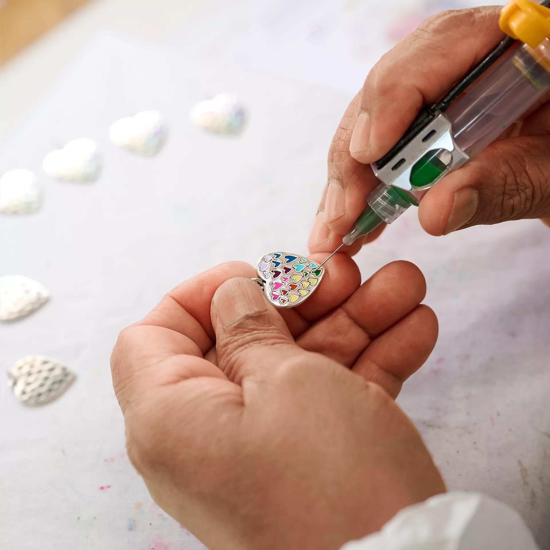 A rainbow of smaller enameled hearts populate the larger sterling silver heart to make this charm simply explode with color and love. As if they were hand-drawn, the hearts are of all various shapes and sizes, symbolizing that love is unique and bShop All Rings brightness to our lives. This multicolor heart charm, designed in the Texas Hill Country, would complement many of our other enamel charms on a bracelet or necklace. The back of the silver charm can be engraved with a name, initials or sweet saying that makes it one-of-a-kind.