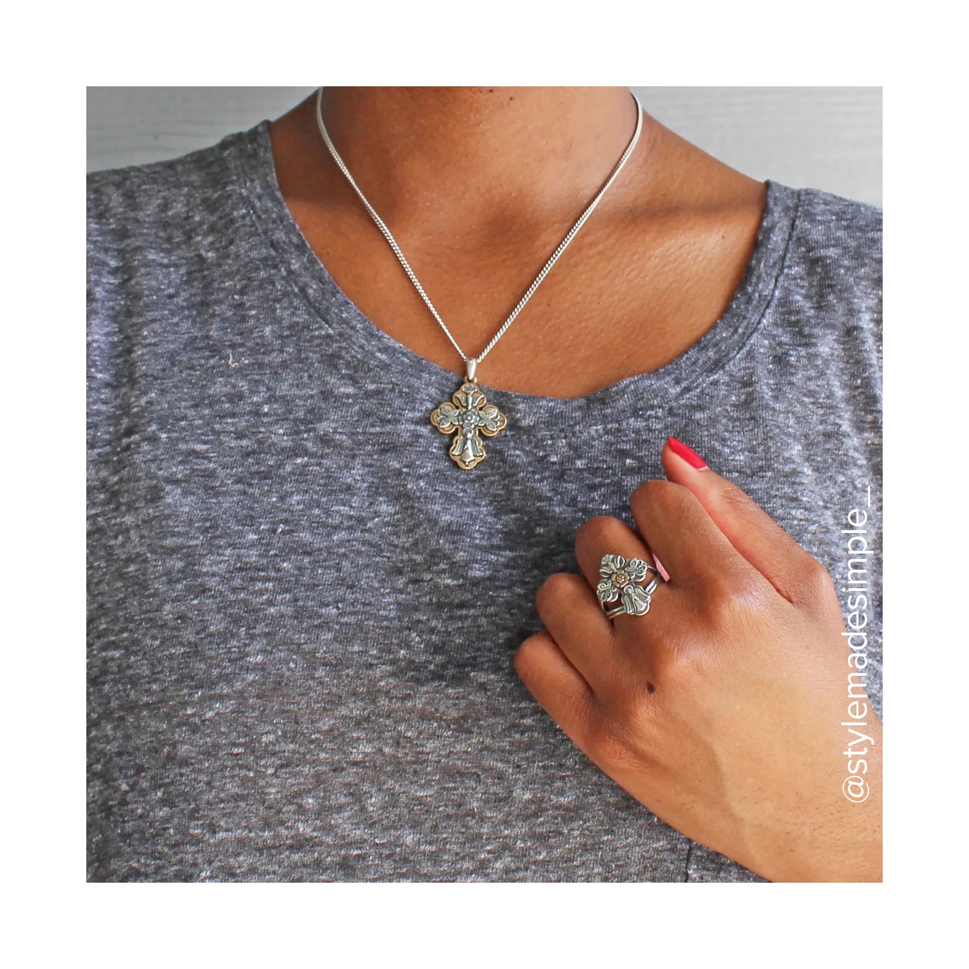 This design is retiring from our active line and once the remaining stock is sold, it will no longer be available. The sterling silver and bronze La Vida Nueva Cross Ring combines a descending dove, a praying angel, a rose and butterflies to create a beautiful symbol of faith and new life.